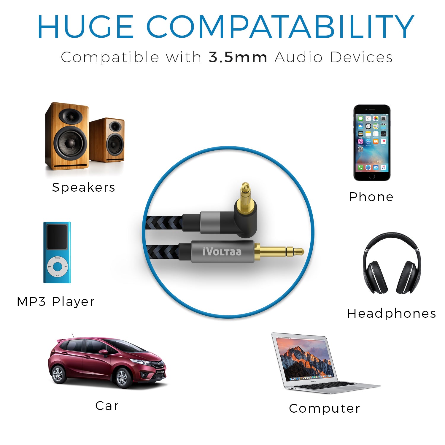 - Use: iVoltaa 3.5mm audio stereo cable 90 degree right angle can easily connect any of your 3.5mm audio port equipped iPod, iPhone, iPad, smartphone, mp3 player or tablets to your car, portable wireless Bluetooth speakers or home stereo, compatible with any digital devices with standard 3.5mm jack audio, like beats headphones, iPhone, iPod, Samsung galaxy, laptop, tablets, mp3 players, cell phones, car/home aux stereo, speaker etc.